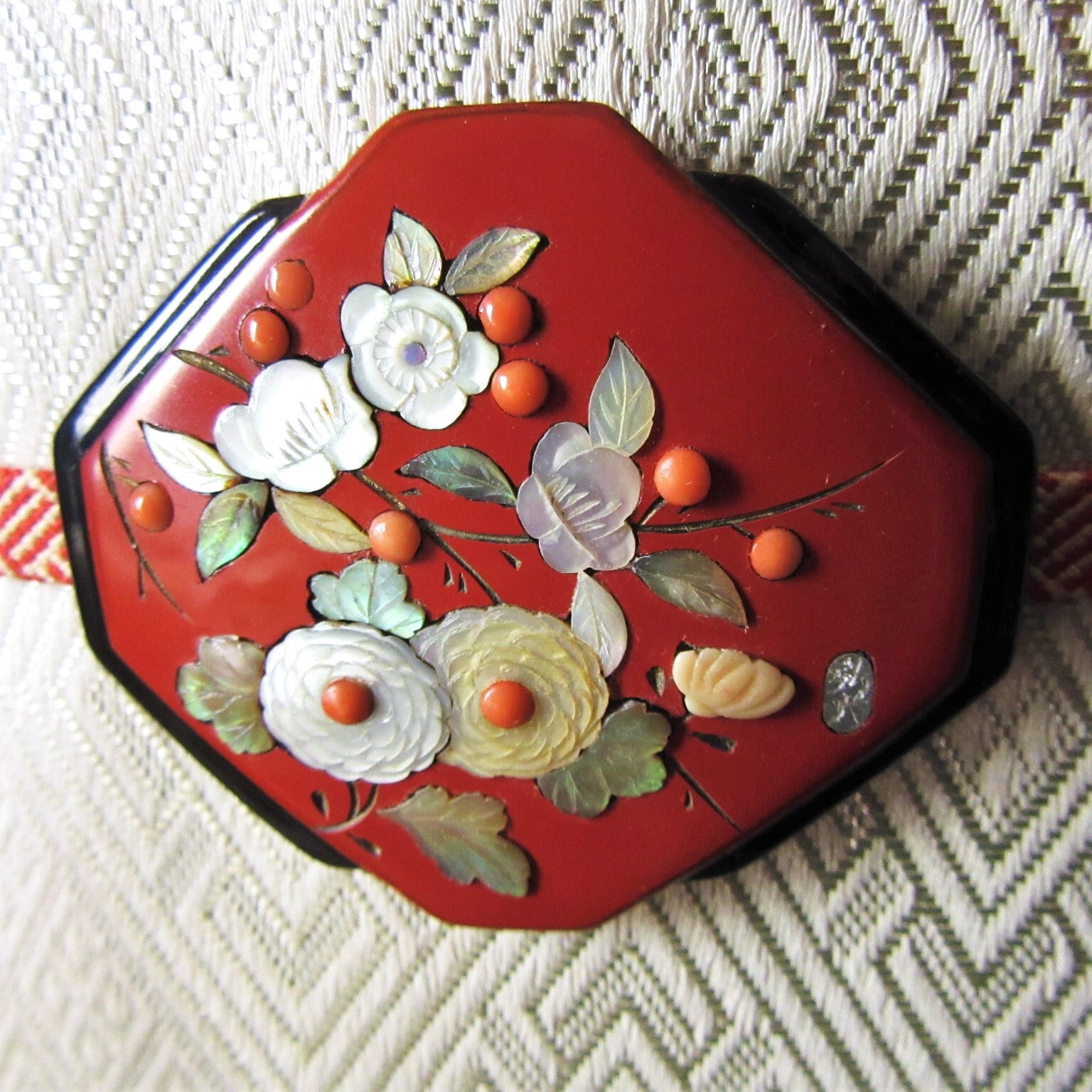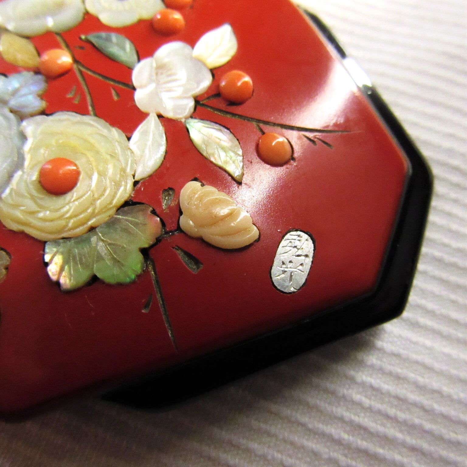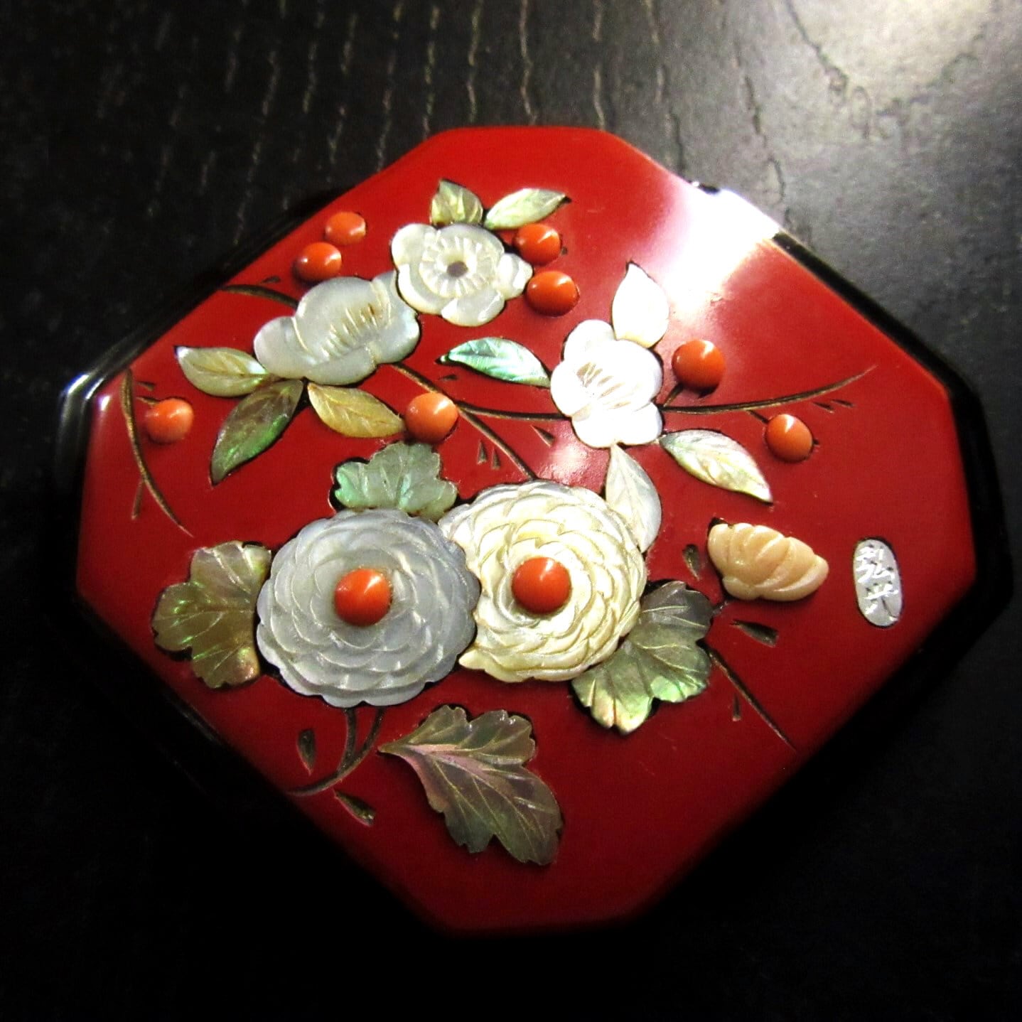 梅に南天・菊 芝山細工 帯留 アンティーク 着物 珊瑚 在銘
