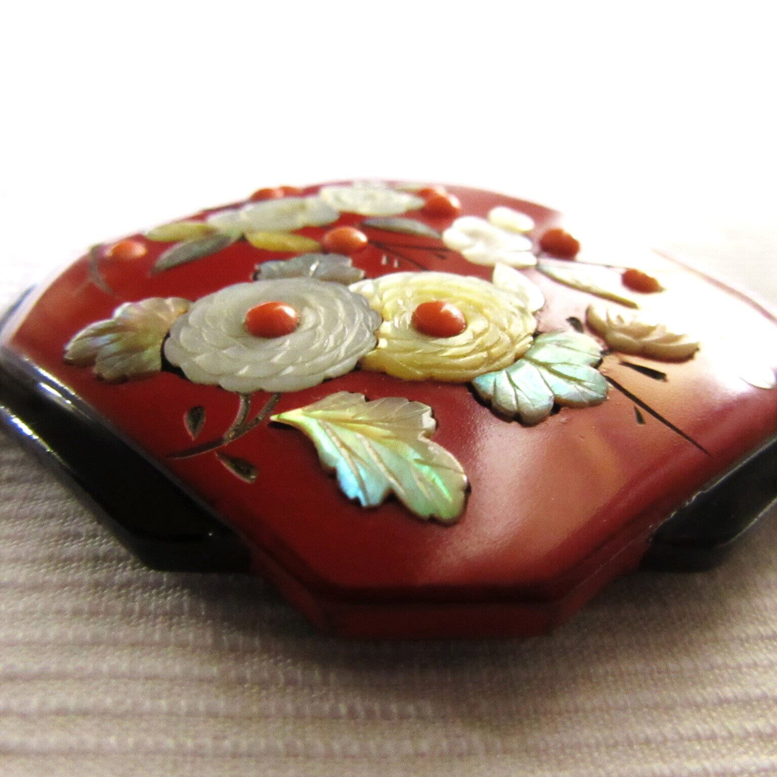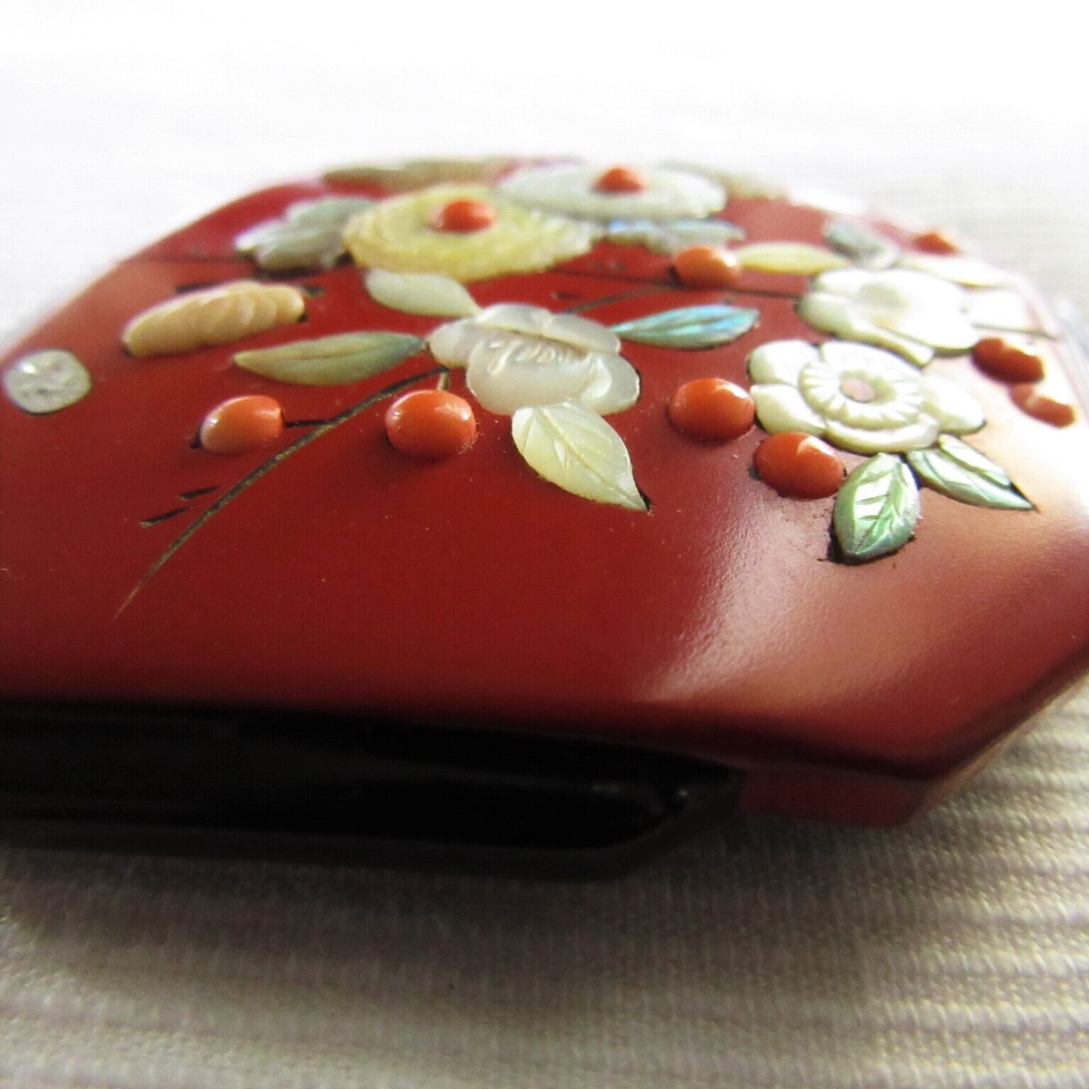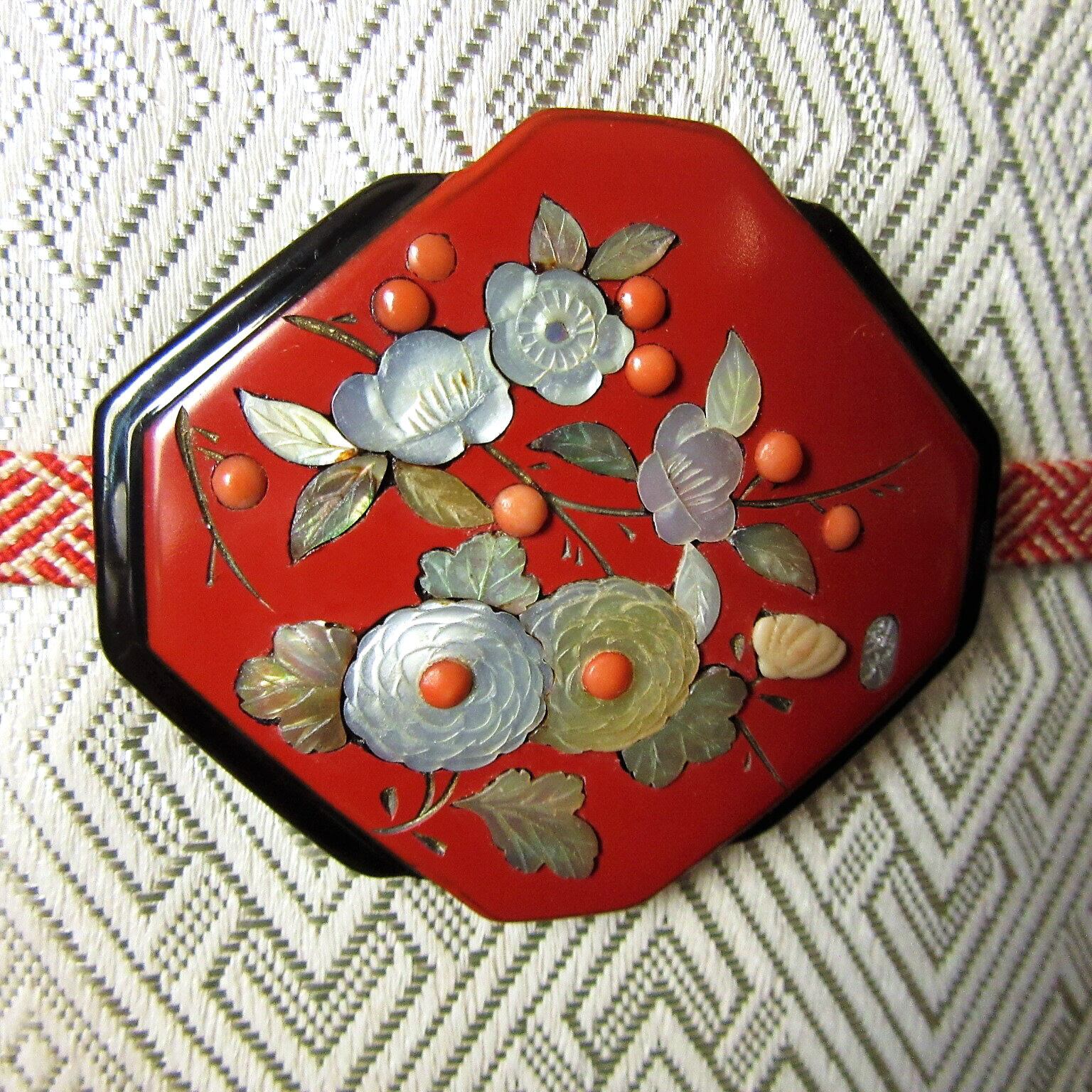 梅に南天・菊 芝山細工 帯留 アンティーク 着物 珊瑚 在銘